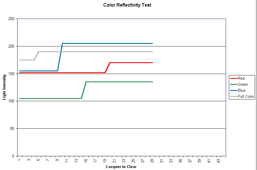 These columns indicate the differences in the amount of change between the different light source colors. The lacquer absorbs more blue light while the clear area reflects more of this color providing the most amount of change. This indicates how much more contrast can be produced between the clear metal and the lacquer coating on the metal using a blue light source.