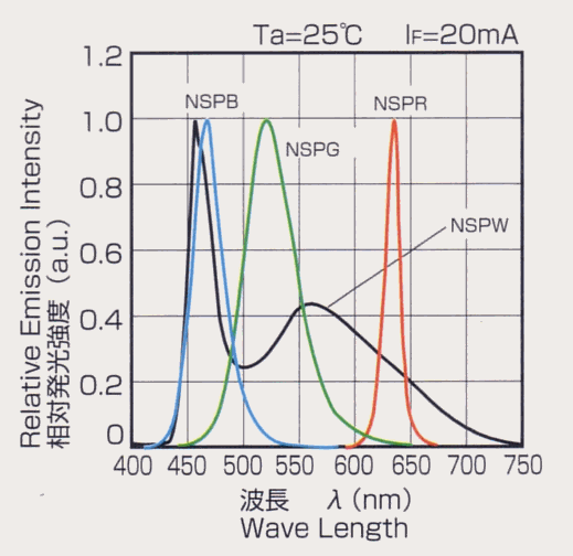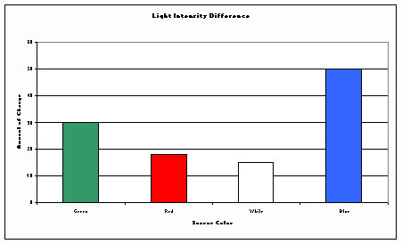 Based on the indications that blue light produced the most distinct contrast, a blue light source was selected. To meet the requirement that the unit have a Mean Time Between Failure(s) of one year, an LED was chosen as the light source. LEDs have a typical useful life expectancy of approximately 100,000 hours or nearly 11 years of continuous use. The graph above shows the narrow range of blue light produced by the high intensity blue LEDs shown above.