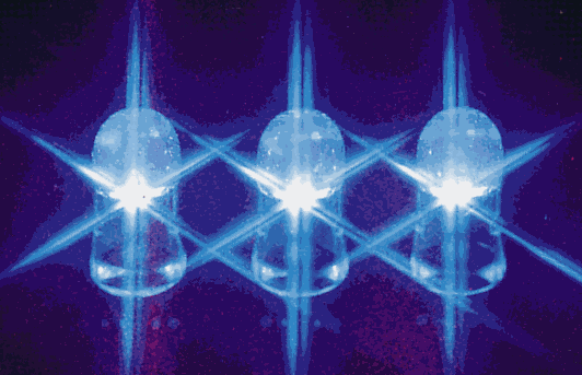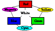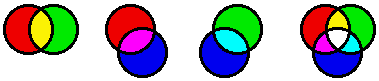 These circles show the effects of adding the primary colors of red, green and blue light together. The results produce magenta, yellow, cyan and white light.