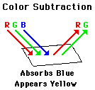This shows the effects of absorption. Red, green and blue light strike the surface, but due to the absorption of blue, only red and green are reflected back from the surface. This is the same phenomenon, which produces the contrast range necessary for the optical sensor to work in detecting contamination on the metal sheets. Contamination will reduce the amount of light reflected back from what should be a clear area and alter the signal level expected to be present.