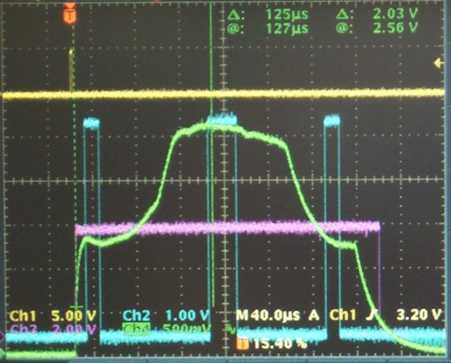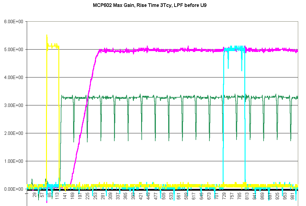 An extreme magnification shows the trigger pulse in yellow, the raw pixels from the Linear Array in green, the filtered and amplified signal in magenta and the first data sample, taken after pixel 12, in cyan. The sample is captured, measured and stored as a binary value in less than 2uS. Each pixel has a sampling time of 1uS. The MCP602 op amp is able to reach maximum gain in 3uS missing only the first 3 pixels after the raw signal is filtered and amplified. Since the first pixel sampled is number 12, this is not a problem. The op amp has a very high slew rate, ideal for operating at 5 volts. This allows all of the circuitry on the PCB to operate from a single supply.