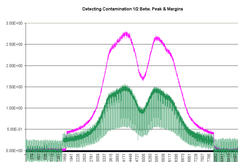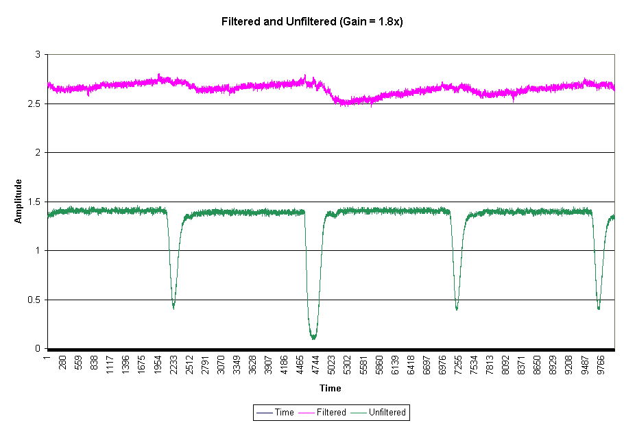 The magenta signal is the filtered and amplified signal from Linear Array Optical Sensor. The profile indicates the presence of contamination where the peak amplitude has a deep V-shaped notch. The green signal is the raw, unfiltered, unamplified signal from the Linear Array. The gain stage provides an amplification factor of approximately 1.8 times the original signal level.