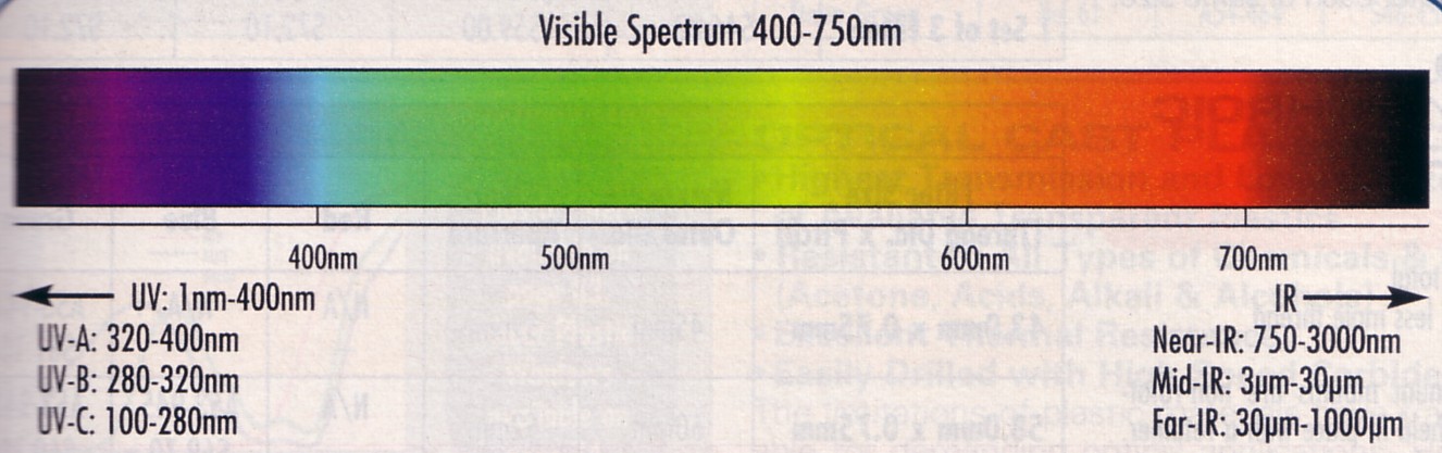 This is the full visible spectrum. It shows where the specific wavelengths of light referenced in this document are located relative to each other.